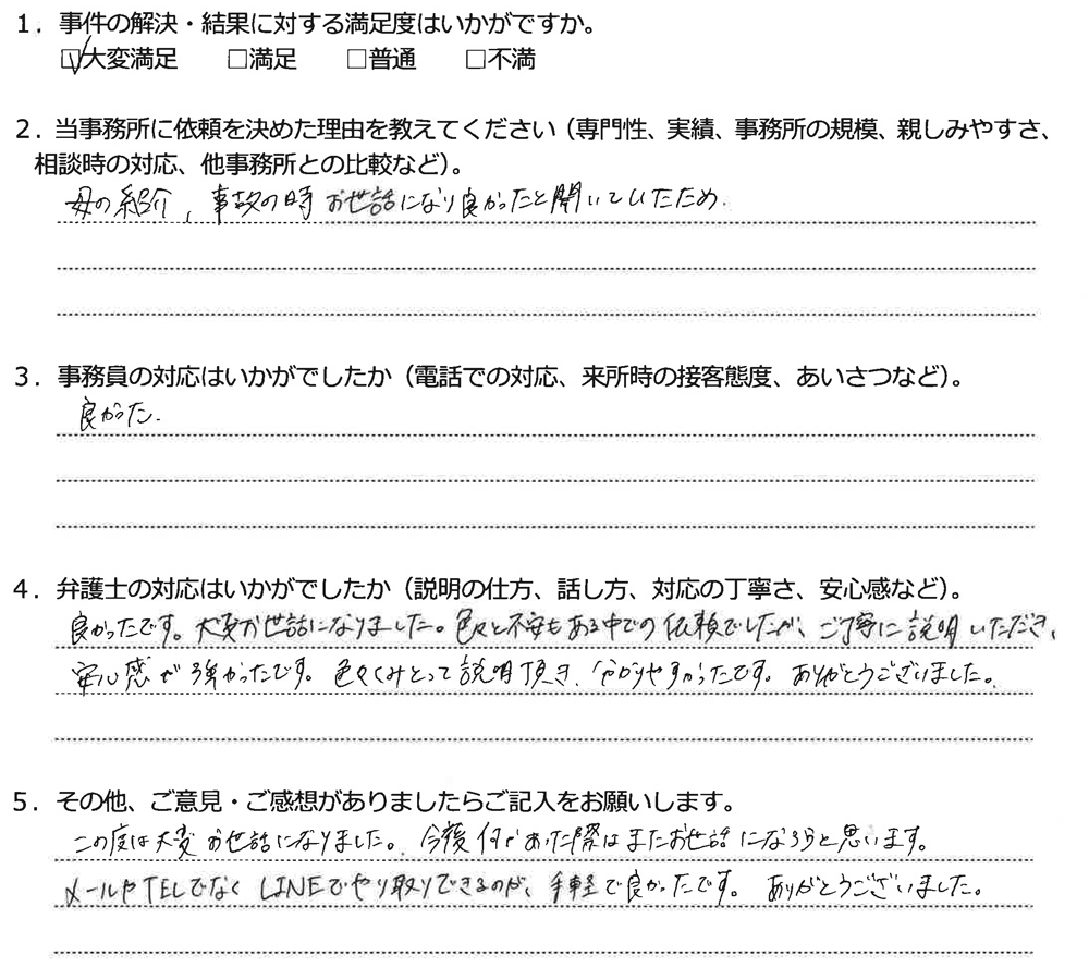 この度は大変お世話になりました。今後何かの件があればまたお世話になるように思います。メールやTELでなくLINEでもやり取りできるのが手軽で良かったです。ありがとうございました。